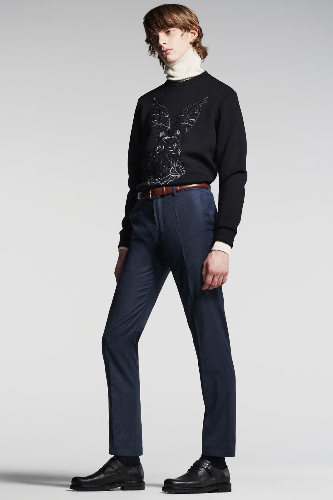 Suiting is casual with skinny cuts repeated throughout the collection, completed with printed silk scarves and leather shoes and trainers.